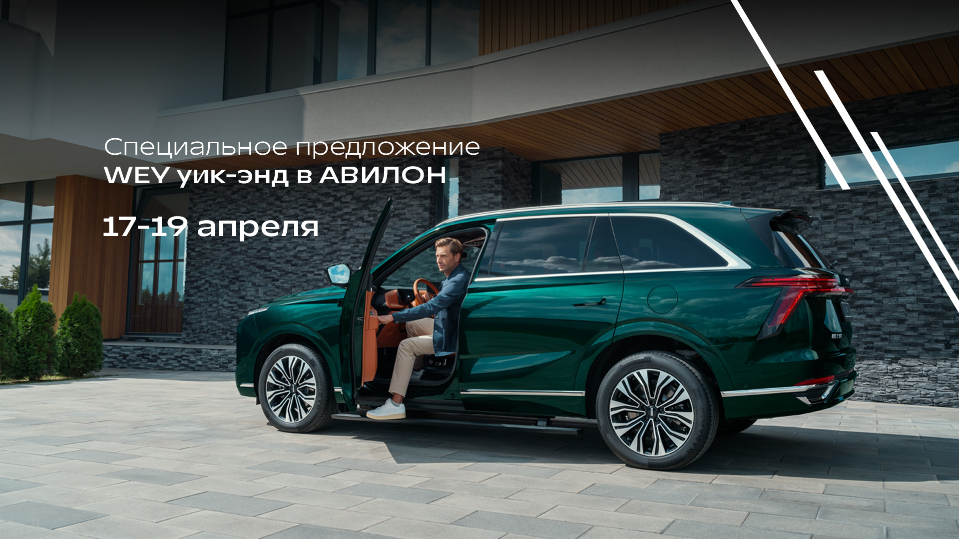 Откройте для себя выгодные условия на автомобили WEY в рамках специального предложения «WEY уик-энд»* . Только с 17 по 19 апреля 2026 в АВИЛОН доступна выгода 300 000 рублей на новые автомобили WEY 07 и WEY 80 2024–2025 года производства.